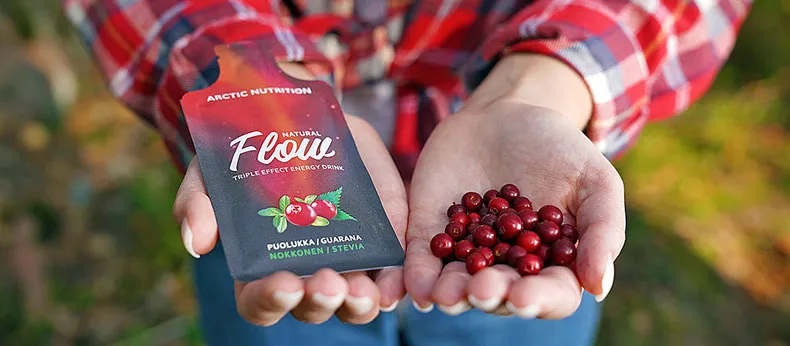 Flow is made from all-natural ingredients. Triple effect gives energy, increases fat burning capabilities and has strong antioxidant effects. A whole handful of pure Arctic lingonberries are used for each dose of Flow.